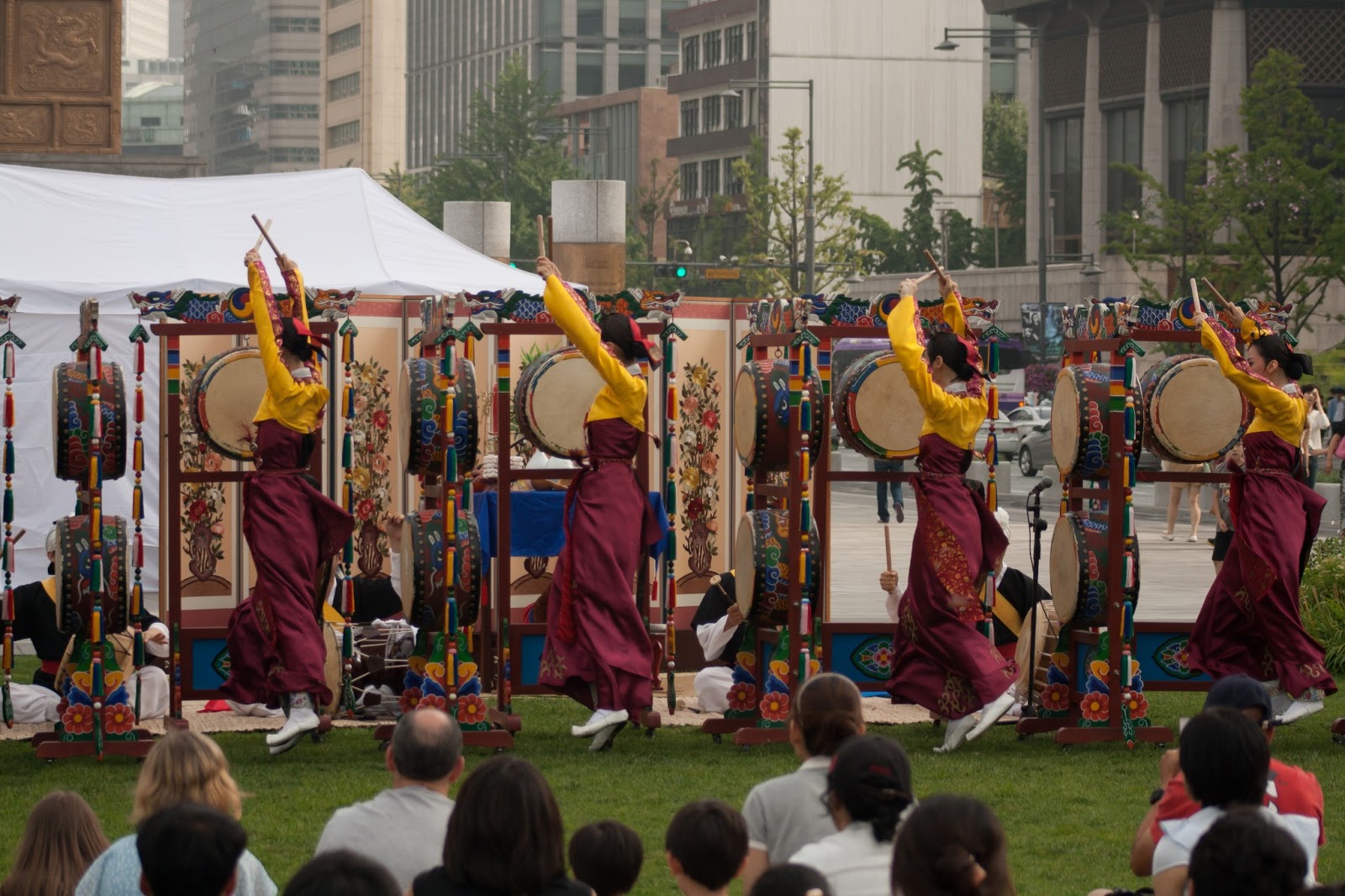 Not too far down the street we encountered a hubbub of activity as a group of brightly dressed Koreans were setting up an area of grass as a stage. Quite a group of people were already seated on the grass ready to watch whatever was about to happen. We hung around, interested to see what would take place. After a little while of waiting, and more people joining us on the grass, a free cultural show started. We were so surprised and delighted to have happened upon such a wonderful display of Korean culture. The program started with a women's drumming group, which did an amazing job! Next came a men's musical group, which did all kinds of very neat skills, all while playing on their instruments. Finally we watched a play, narrated in both Korean and English, depicting a traditional courtship and marriage through song and dance.